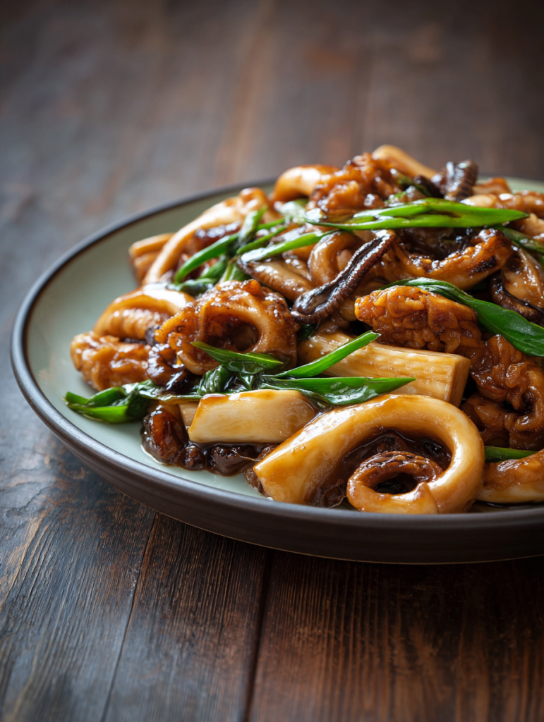CALAMARI IN FUNGHI E BAMBU CALAMARI CON SALSA SATAY CALAMARI IN SALSA PICCANTE